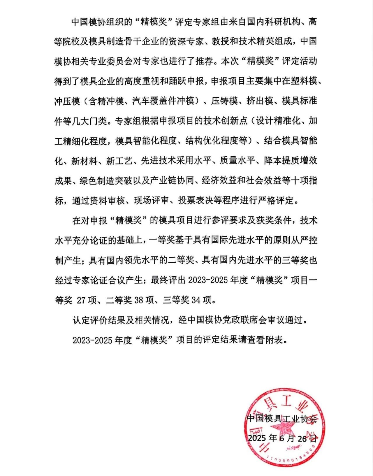 我司荣获2023-2025年度中国模具工业协会“精模奖”,其中有两个一等奖,以及一个二等奖。